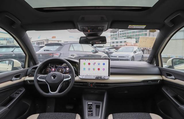 进入车内,内饰空间呈现数字化座舱的革新理念,12.3英寸全液晶仪表与12.9英寸中控屏组成双联屏布局,中控屏向驾驶员倾斜8°以提升操作便利性。中控台采用软质搪塑与金属饰板拼接工艺,GTI车型加入红色缝线和经典格子布座椅,运动氛围与德系精致感并存。三辐式方向盘集成触控按键(带震动反馈),真皮包裹的3/9点位置采用打孔设计,握感厚实且防滑。电子挡把体积缩小后释放出储物空间,无线充电板与杯架布局更符合人体工学。乘坐空间方面,2631mm轴距带来同级领先的腿部空间,仿皮座椅宽大厚实,支持电动调节与加热功能。后备厢容积380L,后排座椅支持4/6比例放倒,最大可扩展至1230L,满足家庭多样化载物需求。可选装的30色氛围灯、哈曼卡顿音响及HUD抬头显示,进一步提升了座舱的科技豪华感。